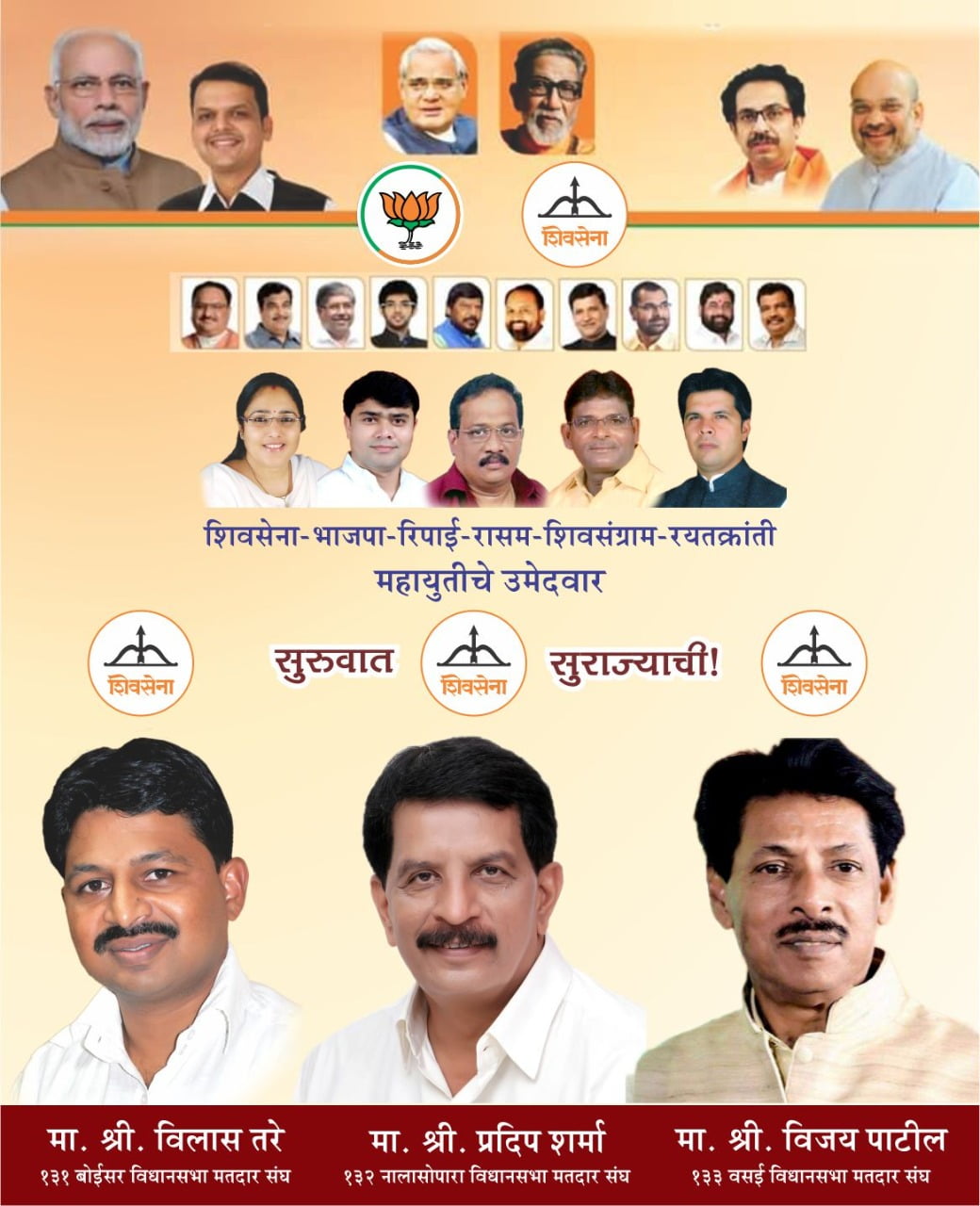 कॉंग्रेसला सोड चिट्ठी देवून सेनेला जातीयवादी म्हणणारे वसई विधानसभेचे शिवसेनेचे उमेदवार विजय पाटील यांना तिकीट दिल्याने स्थानिक इच्छुकां मध्ये मोठी नाराजी निर्माण झाली आहे. बहुजन विकास आघाडीला सोडचिट्ठी देवून सेनेत आलेले बोईसर मतदार संघात विलास तरे ,आणि नालासोपारा मतदारसंघात एन्काऊंटर फेम प्रदीप शर्मा,वसई मतदारसंघात विजय पाटील यांचे फोटो असलेला शिवसेना भाजप,रिपाई , रासप च्या ऐवजी रासम,शिवसंग्राम ,रयतक्रांती,महायुतीचे उमेदवार सुरवात सुराज्याची असे लिहिलेल्या नालासोपारा ,वसई ,बोईसर मतदार संघाच्या शिवसेनेच्या उमेदवारांनी खासदार राजेंद्र गावितांचे अस्तित्व नाकारत आहेत का असा सवाल उपस्थित केला जात आहे. त्यांच्या बॅनरवर .जगन्नाथ नड्डा,नितीन गडकरी,चंद्रकांत पाटील,आदित्य ठाकरे,रामदास आठवले(आर.पी.आय),महादेव जानकर (रा.स.प.),विनायक मेटे(शिवसंग्राम),सदाभाऊ खोत,एकनाथ शिंदे,रवींद्र चव्हाण यांचे फोटो लावण्यात आले असून भाजपच्या नेहा दुबे,राहुल सिंह,सुभाष साटम, शिवप्रताप सिंह, माजी जिल्हाप्रमुख शिरीष चव्हाण यांचे फोटो त्या बॅनरवर झळकत असून शिवसेनेचे खासदार राजेंद्र गावित यांचा फोटो सगळेजण शोधात असून गावितानी सेनेचा राजीनामा दिला आहे का ? जर नसेल तर त्यांचे अस्तित्व कोण नाकारत आहे. हे आता नागरिक विचारत आहेत. त्यामुळे सेना भाजप युती झाली असली तरी आम्ही करू ती पूर्व म्हणणाऱ्या अतिउत्साही कार्यकर्त्यांना समज न दिल्यास त्याचा फटका युतीला बसण्याची शक्यता वर्तवली जात आहे.दरम्यान खासदार राजेंद्र गावित यांच्याशी संपर्क साधला असता त्यांच्याशी संपर्क होऊ शकला नाही. त्यामुळे त्यांची प्रतिक्रिया मिळू शकली नाही.